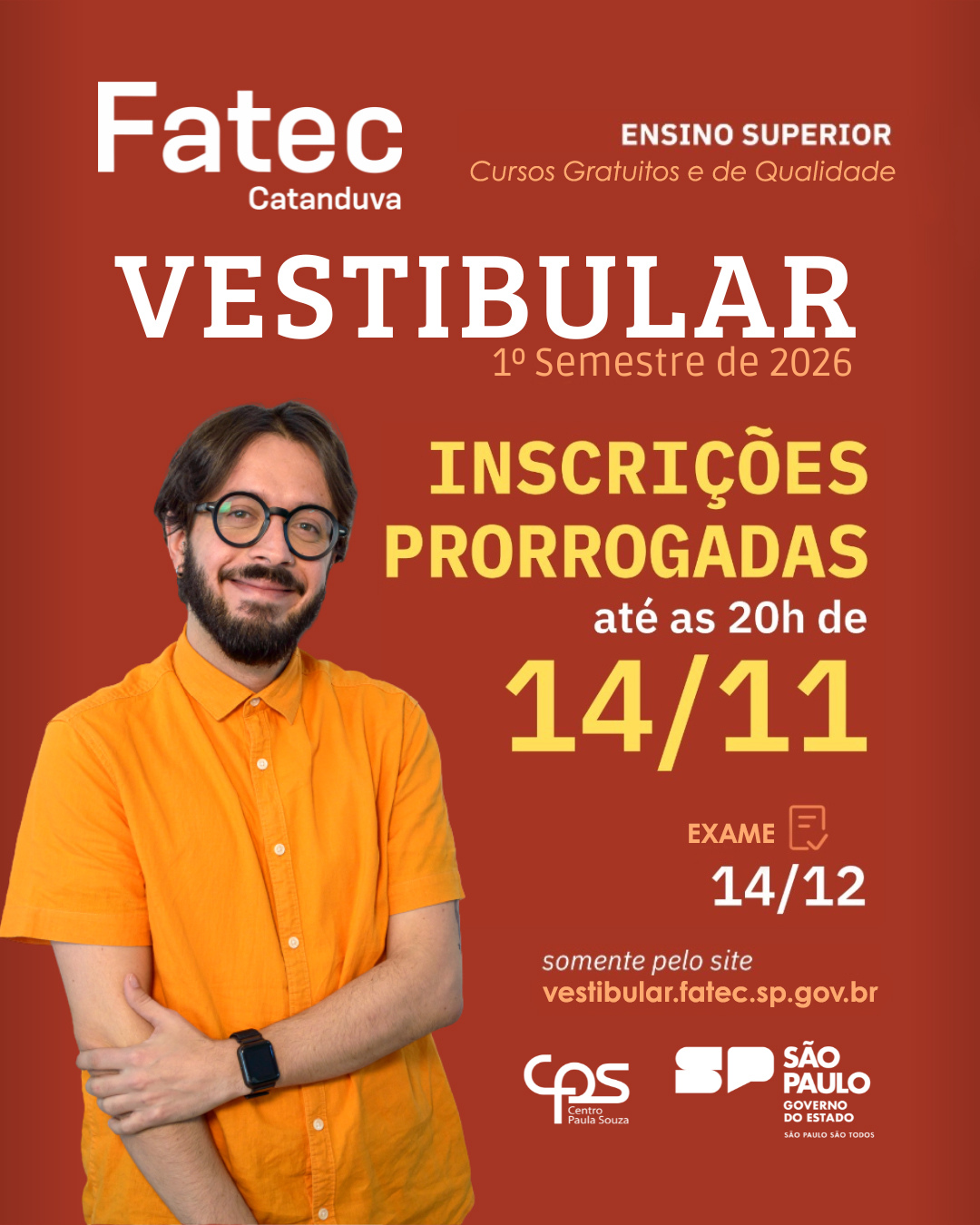 ⚠️INSCRIÇÕES PRORROGADAS ATÉ 14/11/2025⚠️ 🎓 Vestibular Fatec Catanduva – 1º Semestre de 2026 Ensino Superior, gratuito e de qualidade, você encontra na Fatec Catanduva! 📝 Prova dia 14 de dezembro de 2025 📌...