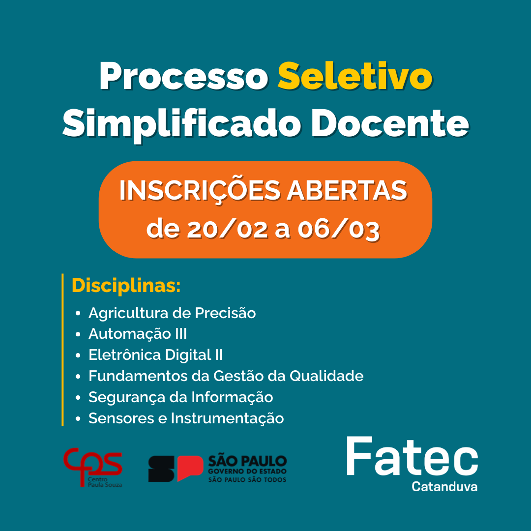As inscrições podem ser feitas até as 23h59 do dia 06 de março de 2026, apenas pelo site: https://urhsistemas.cps.sp.gov.br//dgsdad/SelecaoPublica/FATEC/PSS/inscricoesabertas.asp INFORMAÇÕES Disciplina: Fundamentos da Gestão da Qualidade – Edital PSS 182/11/2026Área(s) da disciplina: Gestão e Administração / […]