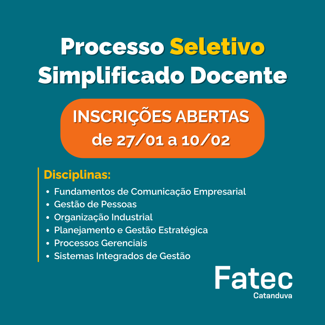 As inscrições podem ser feitas até as 23h59 do dia 10 de fevereiro de 2026, apenas pelo site: https://urhsistemas.cps.sp.gov.br//dgsdad/SelecaoPublica/FATEC/PSS/inscricoesabertas.asp INFORMAÇÕES: Disciplina: Processos Gerenciais – Edital PSS 182/01/2026Área(s) da disciplina: Administração e NegóciosCurso: Gestão da Tecnologia […]