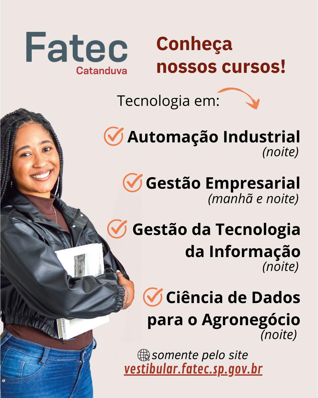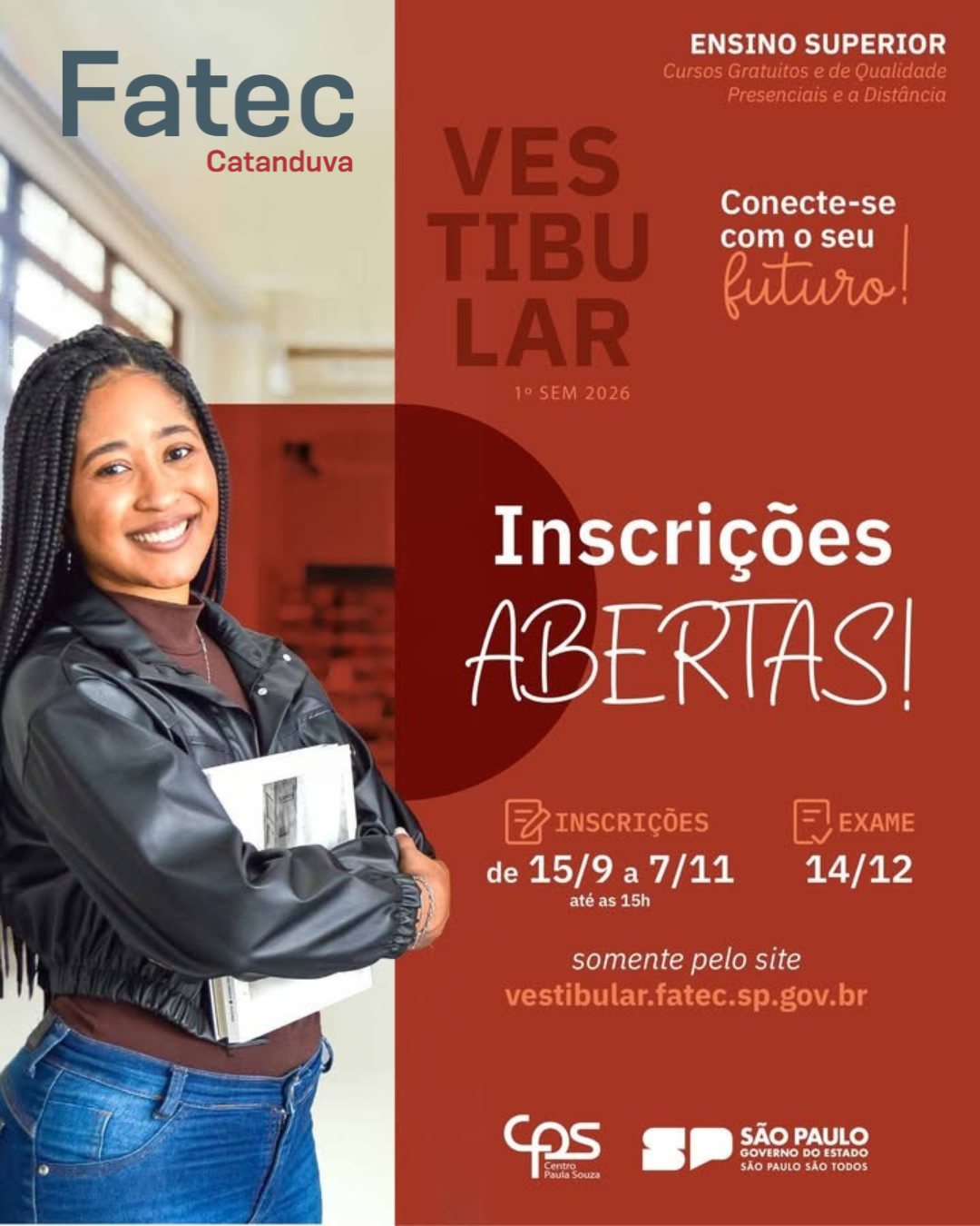 Estão abertas até dia 07/11/2025 as inscrições para o vestibular do 1º semestre de 2026 da Fatec Catanduva. Para se inscrever é preciso acessar o site www.vestibular.fatec.sp.gov.br