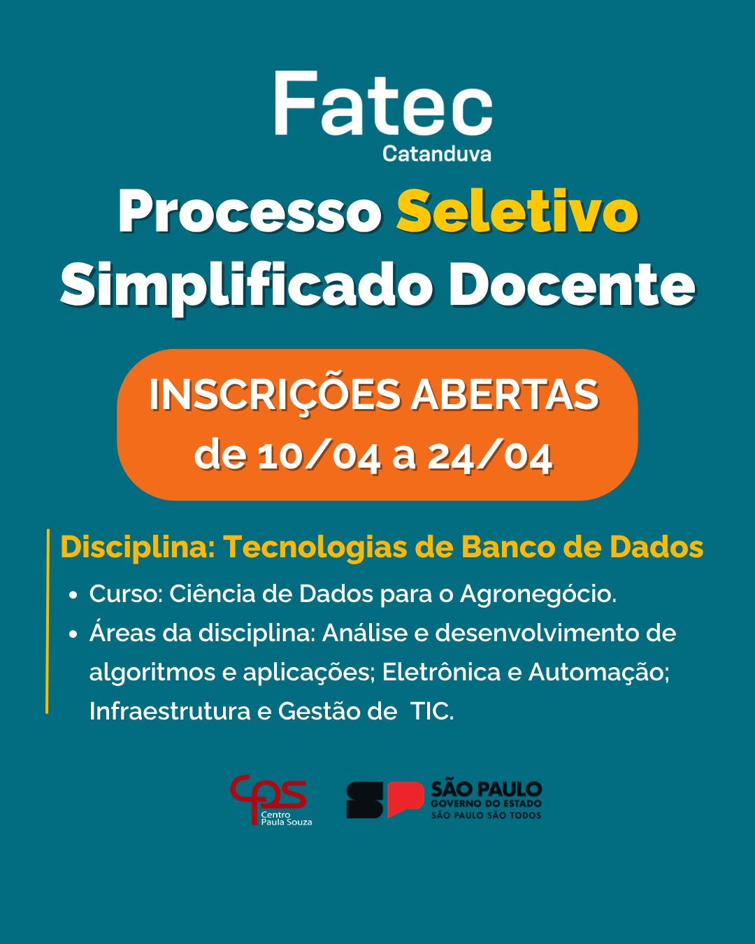 As inscrições podem ser feitas até as 23h59 do dia 24 de abril de 2026, exclusivamente pelo site: 🔗 https://urhsistemas.cps.sp.gov.br/dgsdad/selecaopublica/ ⚡ Disciplina: Tecnologias de Banco de Dados Edital: PSS 182/24/2026 Área da disciplina: Análise e […]
