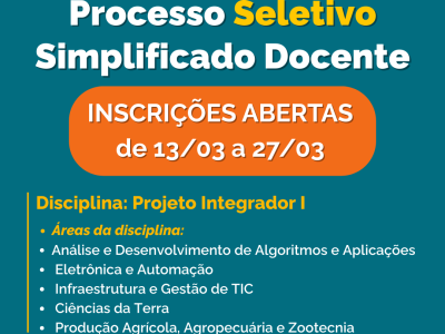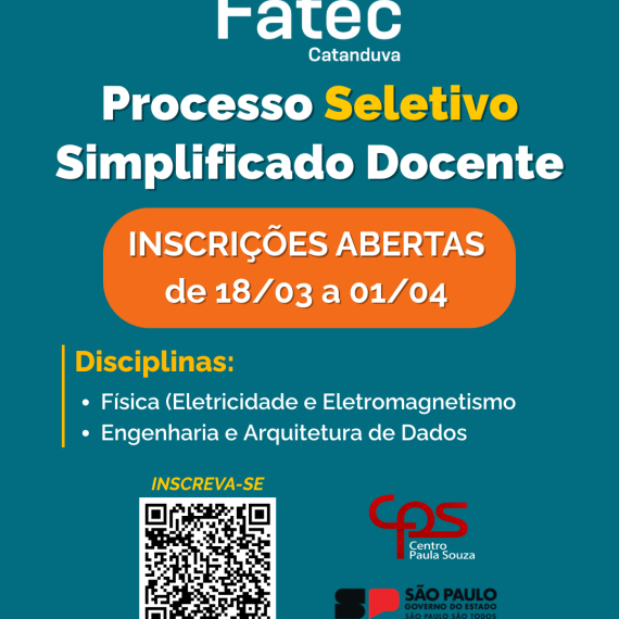 As inscrições podem ser feitas até as 23h59 do dia 01 de abril de 2026, apenas pelo site: https://urhsistemas.cps.sp.gov.br//dgsdad/SelecaoPublica/FATEC/PSS/inscricoesabertas.asp INFORMAÇÕES: ⚡ Disciplina: Física (Eletricidade e Eletromagnetismo) Edital: PSS 182/18/2026 Área da disciplina: FísicaCurso: Automação IndustrialCarga horária: […]